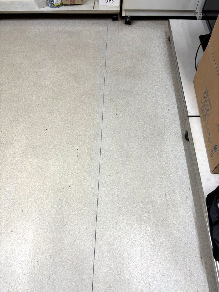 事務所で使用頻度の高い床面は、日常清掃では落としきれない汚れが蓄積しやすいため、機械洗浄(ポリッシャー)による本格的な清掃をご提案・実施しました。
